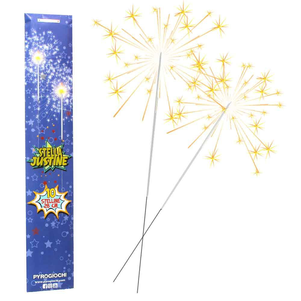 Поздравете ја новата година со златните светки од Stella Josette прскалка жижица. Едно пакување има 10 прскалици, големи 18 цм и се изгаснуваат сами после некое време откако ќе согори материјалот што ги произведува светлите искри. Чувајте ги подалеку од деца под 14 години и држете растојание од најмалку 1 метар откако ќе ги запалите.
