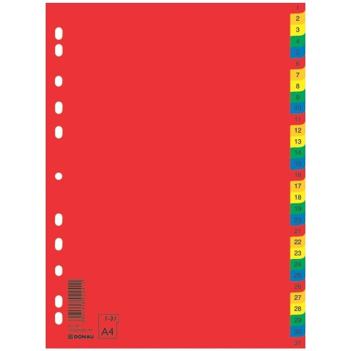 Спецификации • Линија: Donau • Класа: Стандард • Еко-сертификат: Green Point • Боја: Микс бои • Материјал: Полипропилен • Формат: А4 • Број на разделувачи: 31 • Индекс: 1-31 • Број на отвори: 11 • Димензии: 23 цм х 29,7 цм • Дебелина: 120 микрони