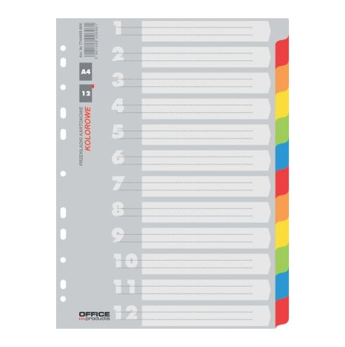 Спецификации • Линија: Office Products • Класа: Економска • Боја: Микс бои • Материјал: Картон • Формат: А4 • Димензии: 223 мм х 297 мм • Број на отвори: 11 • Број на страници: 12 + 1 • Тежина: 170 г
